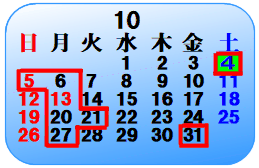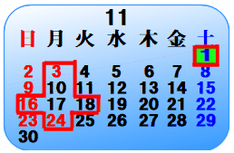 □赤枠は休日です。 ご予約につきまして上記日時は外してくださいますよう、お願いいたします。 |